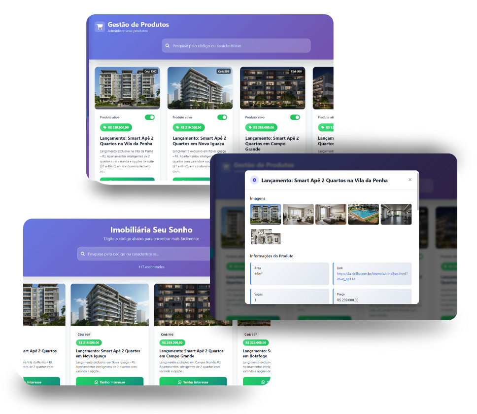 A Central de Comando da Cirilla é a interface que coloca sua imobiliária no controle absoluto de toda a operação. Em um único painel, você gerencia cadastros, leads, equipe, campanhas e resultados com uma fluidez que elimina retrabalho e acelera processos. O cadastro de imóveis se torna instantâneo, basta colar o link do portal e todas as informações são importadas automaticamente, já prontas para compartilhar com links e QR Codes.