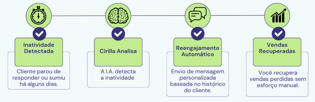 Sim. A Cirilla identifica automaticamente clientes que ficaram sem interação por um período e envia mensagens personalizadas de reativação, sempre com base no histórico e no perfil de interesse de cada cliente.