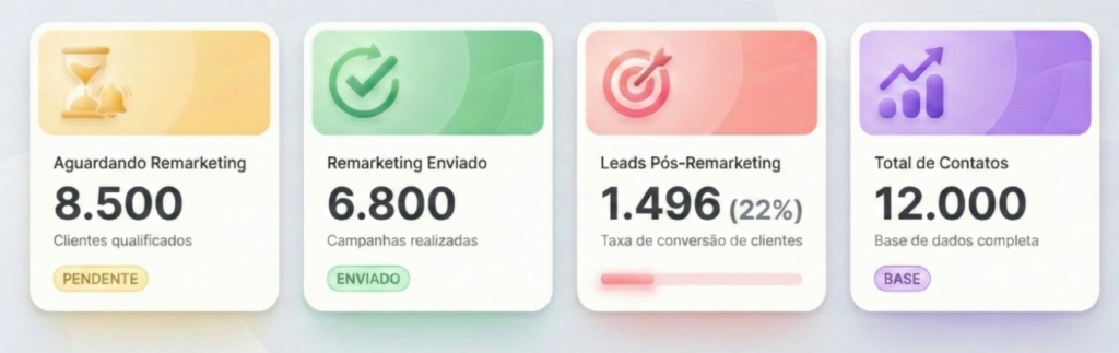 O painel da Cirilla mostra, de forma clara, como o remarketing automático transforma contatos parados em novas oportunidades. Ele acompanha clientes pendentes, campanhas enviadas e leads reativados, mantendo toda a base sempre em movimento.