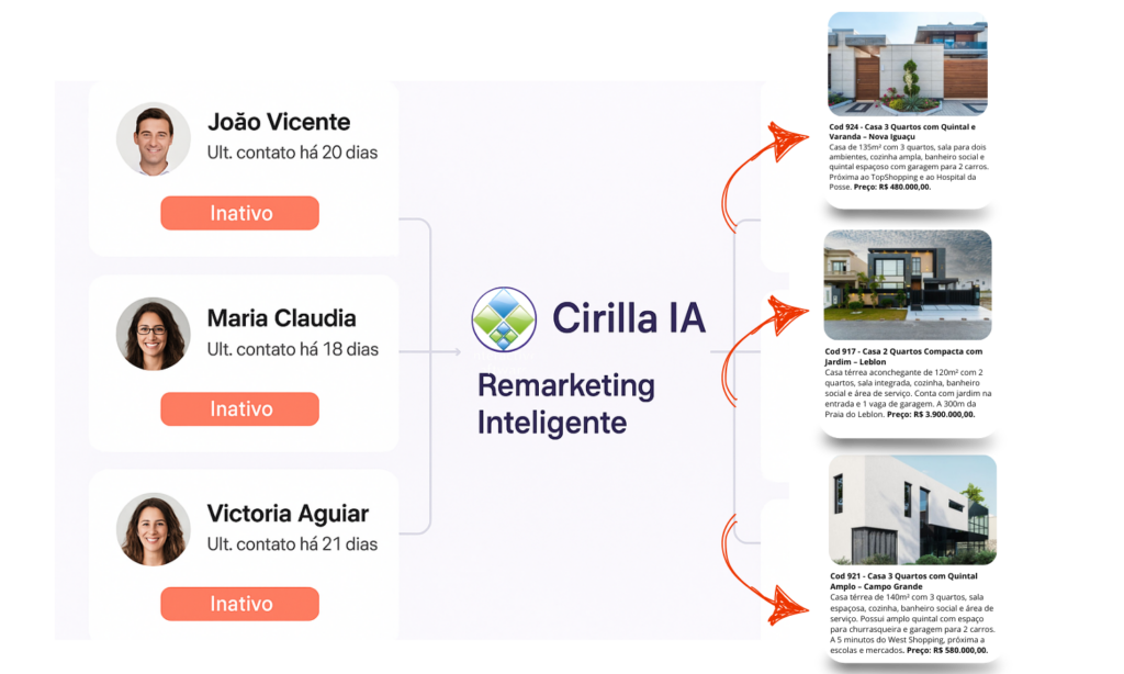 O remarketing da Cirilla trabalha para recuperar oportunidades que ficariam esquecidas. Em vez de sobrecarregar sua equipe com follow-ups manuais, a IA volta a conversar com leads inativos, oferece novos imóveis compatíveis com o perfil e verifica se o cliente ainda está em busca de algo. Isso mantém o relacionamento ativo, reacende o interesse do lead e gera novas chances de venda ou locação — tudo de forma automática, contínua e sem esforço da equipe.